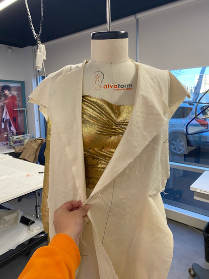 with the fit and flare added it was easy to envision the final garment. This sparked some inspiration to mess around with what she will be wearing underneath. Some gold stretch velour was on the front table which gave the idea of using something like this to drape a gold "armor" like corset underneath.